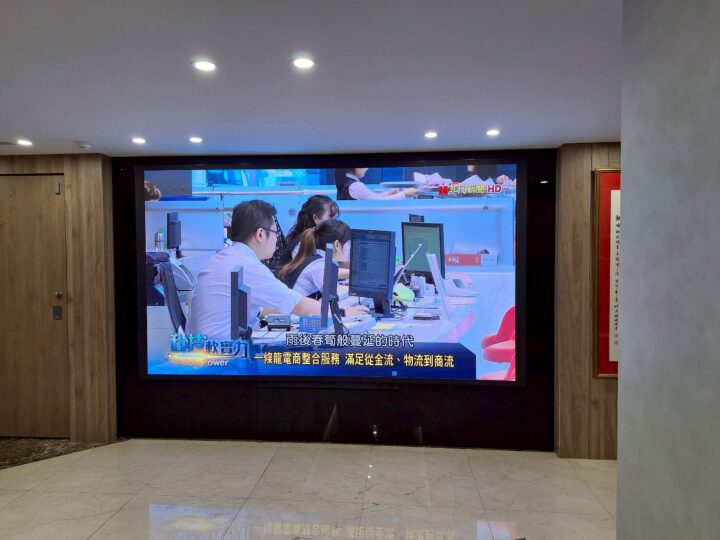 此次透過經銷商規劃,在企業應用方面,最新一代「無邊框 COB P1.25 LED 顯示牆(300x169cm)」已導入台北辦公室門外。該技術採 COB 封裝,將 LED 晶片整合於 PCB 基板上,使畫面更均勻、色彩飽和,並具防塵、防潑水功能。無邊框設計與高解析度可精準呈現文字、影像及現場實況,影像更加生動,增強視覺感染力。此案例充分展現科技美學與應用潛力,也象徵現代科技與日常場域的深度融合。
