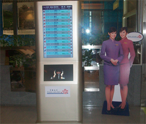 中華航空選用先進的數位看板播放器,藉由2台廣告直立式機構,搭配2台42吋高亮度液晶顯示器,針對所有進入桃園的旅客,強力放送桃園機場航班的重要公告與一般商業宣傳廣告。