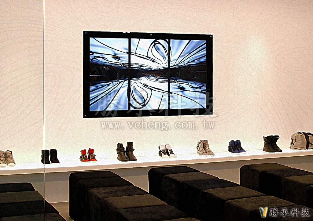 「勝承科技拼接電視牆」設置在人潮流動大百貨店家,從入口店家、牆壁上的螢幕、以及主牆上的3塊螢幕整合成為一個展演舞台,經過店家的人,會先看到電視牆的震撼,接著從商品展示上的螢幕,逐漸聚焦對商品的關注力。